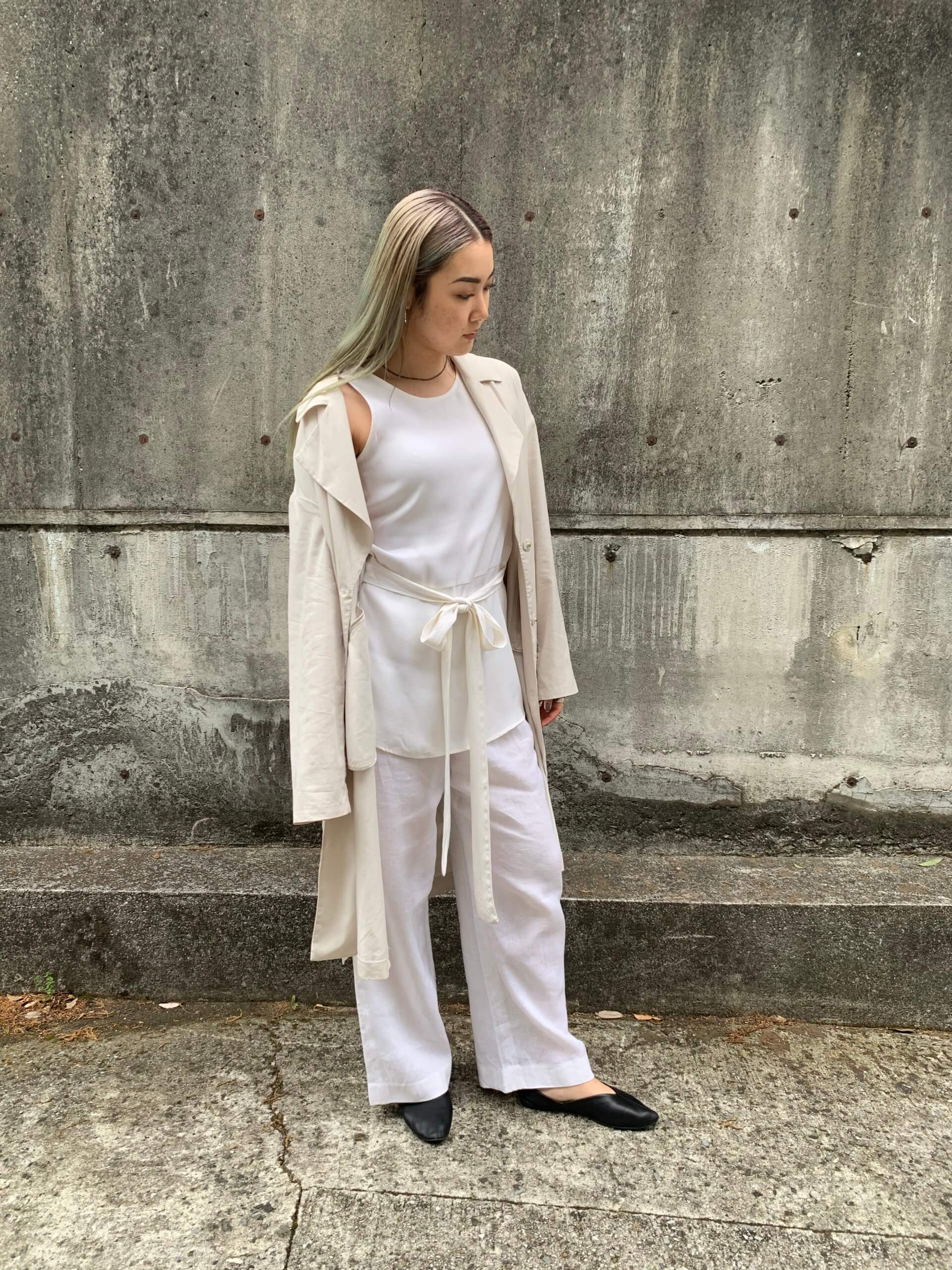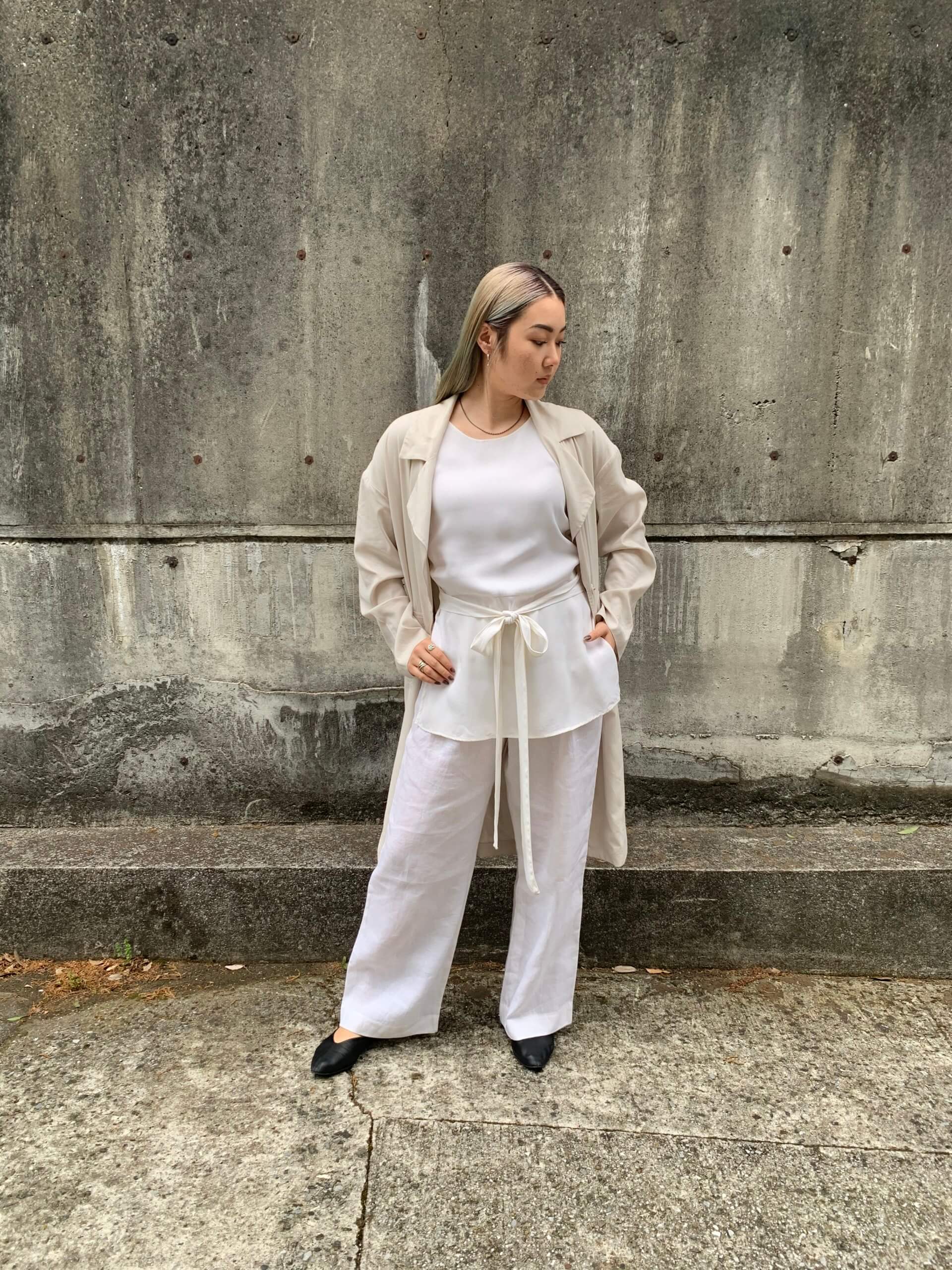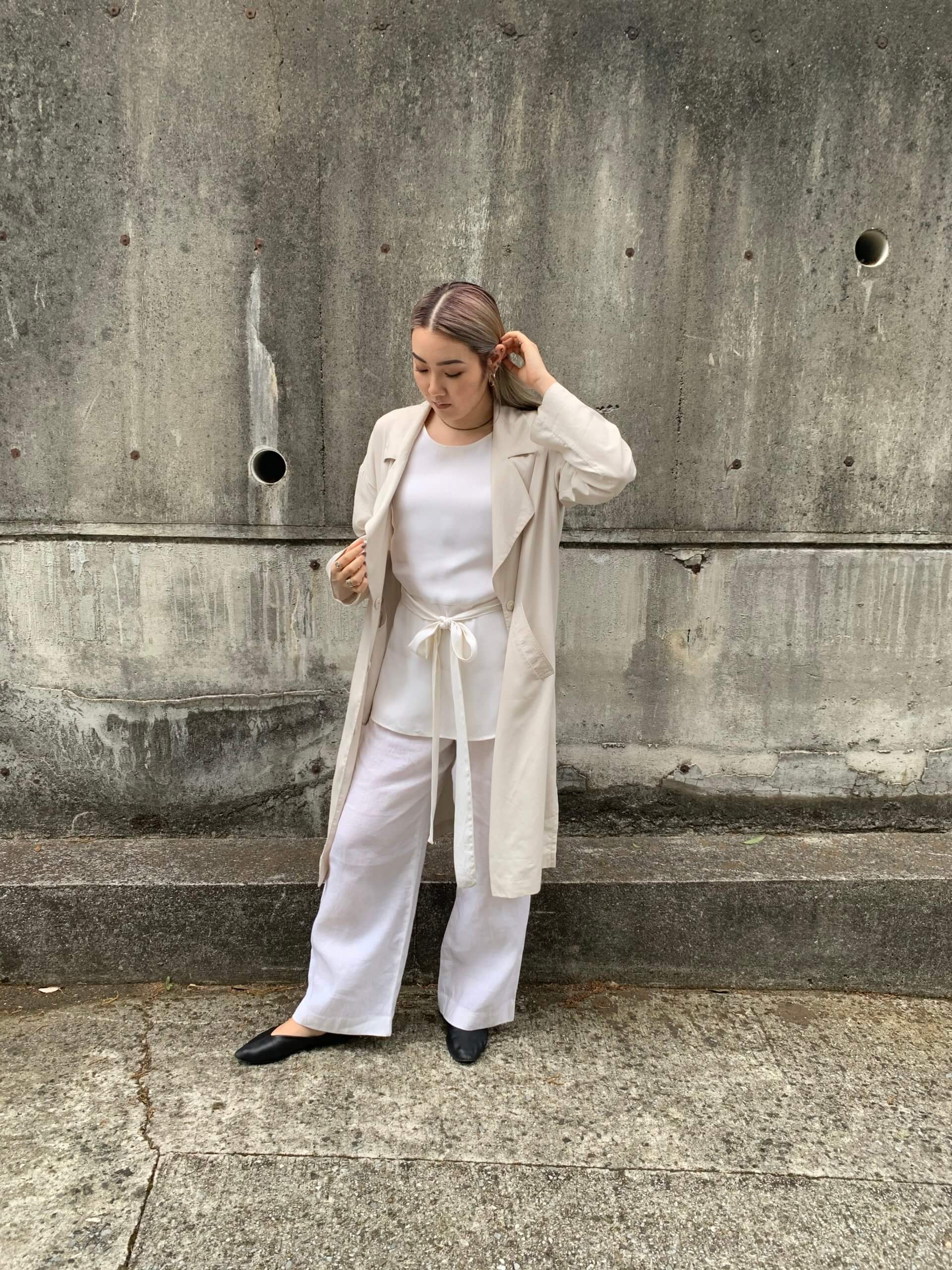 White sleeveless tops with ribbon + White wide pants + Cream long coat + Black flat shoes, Personal Collection
