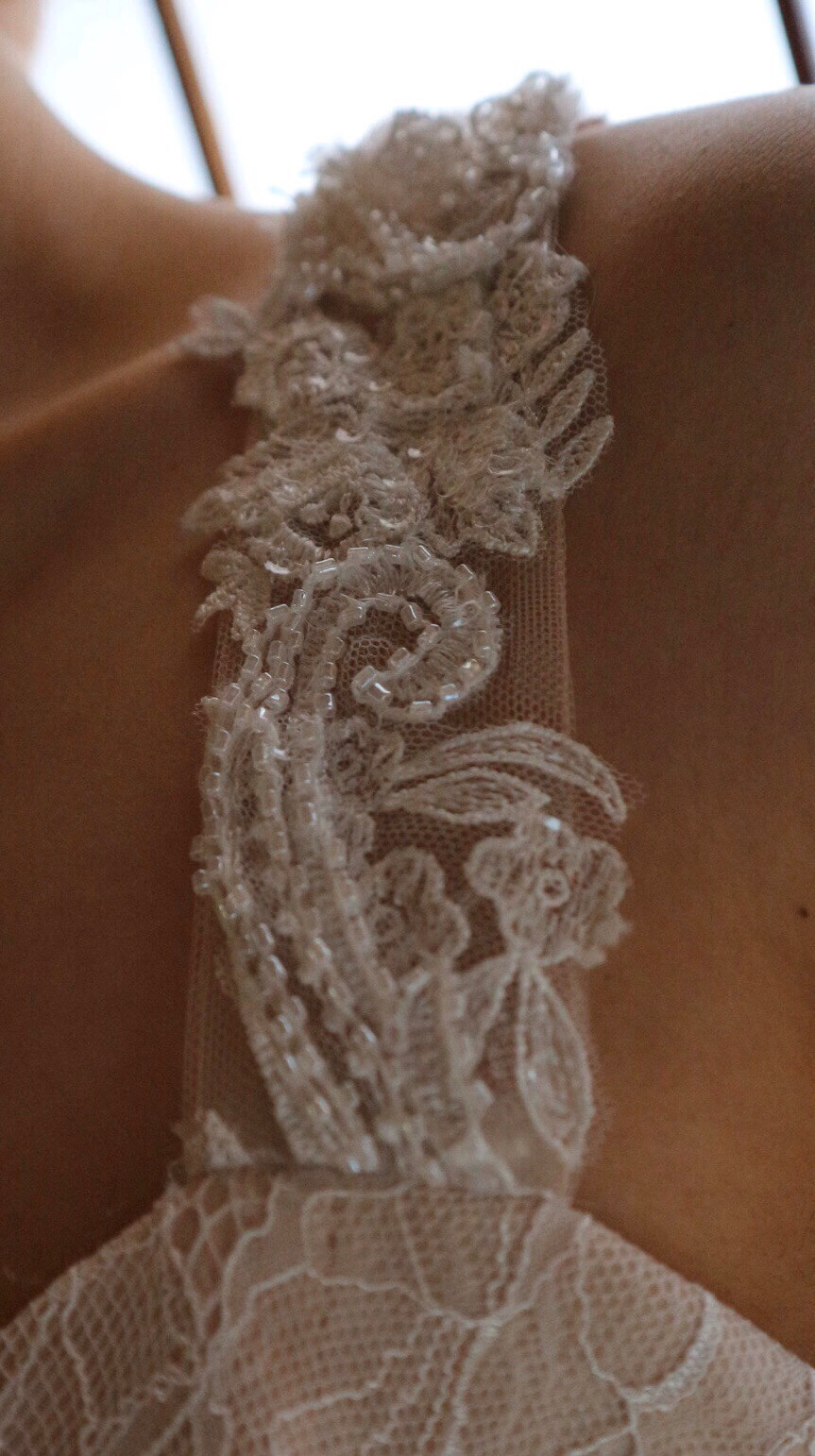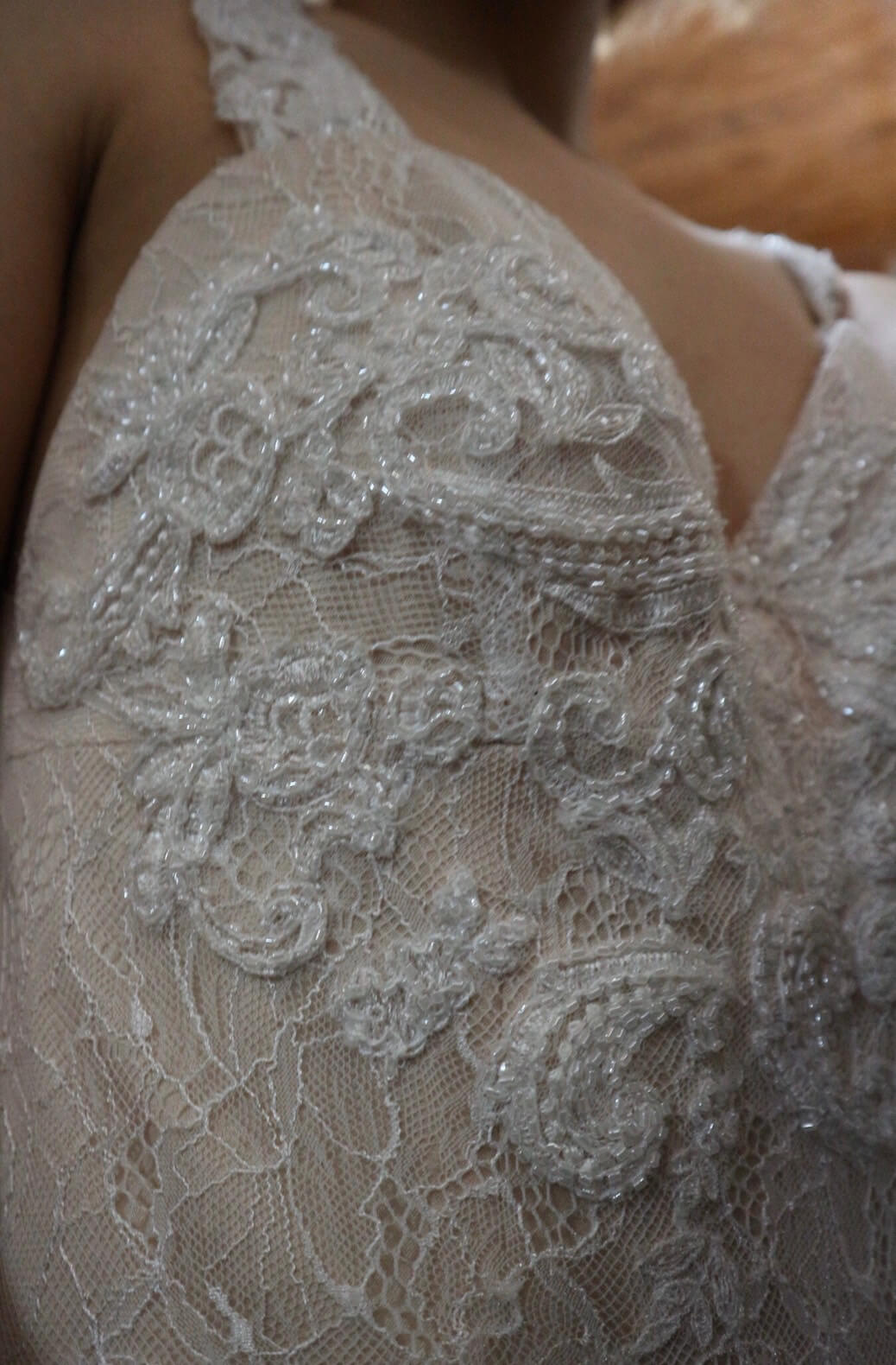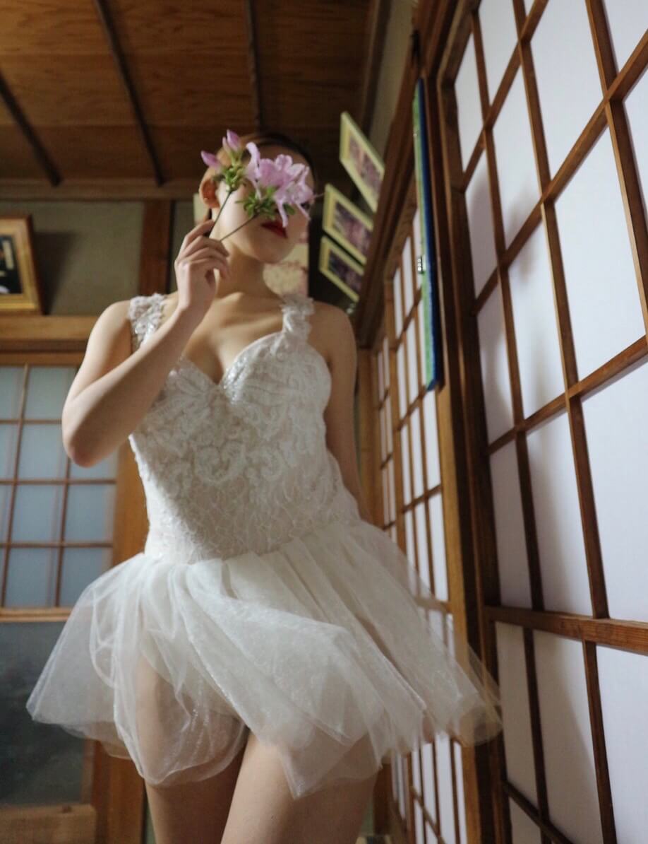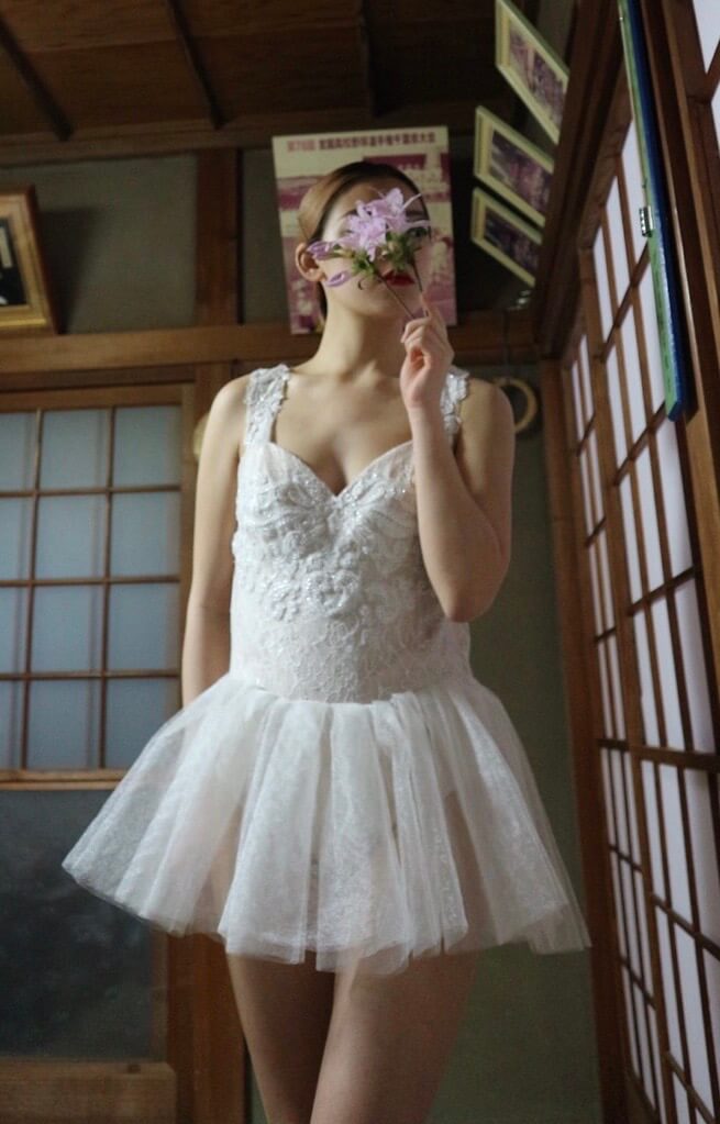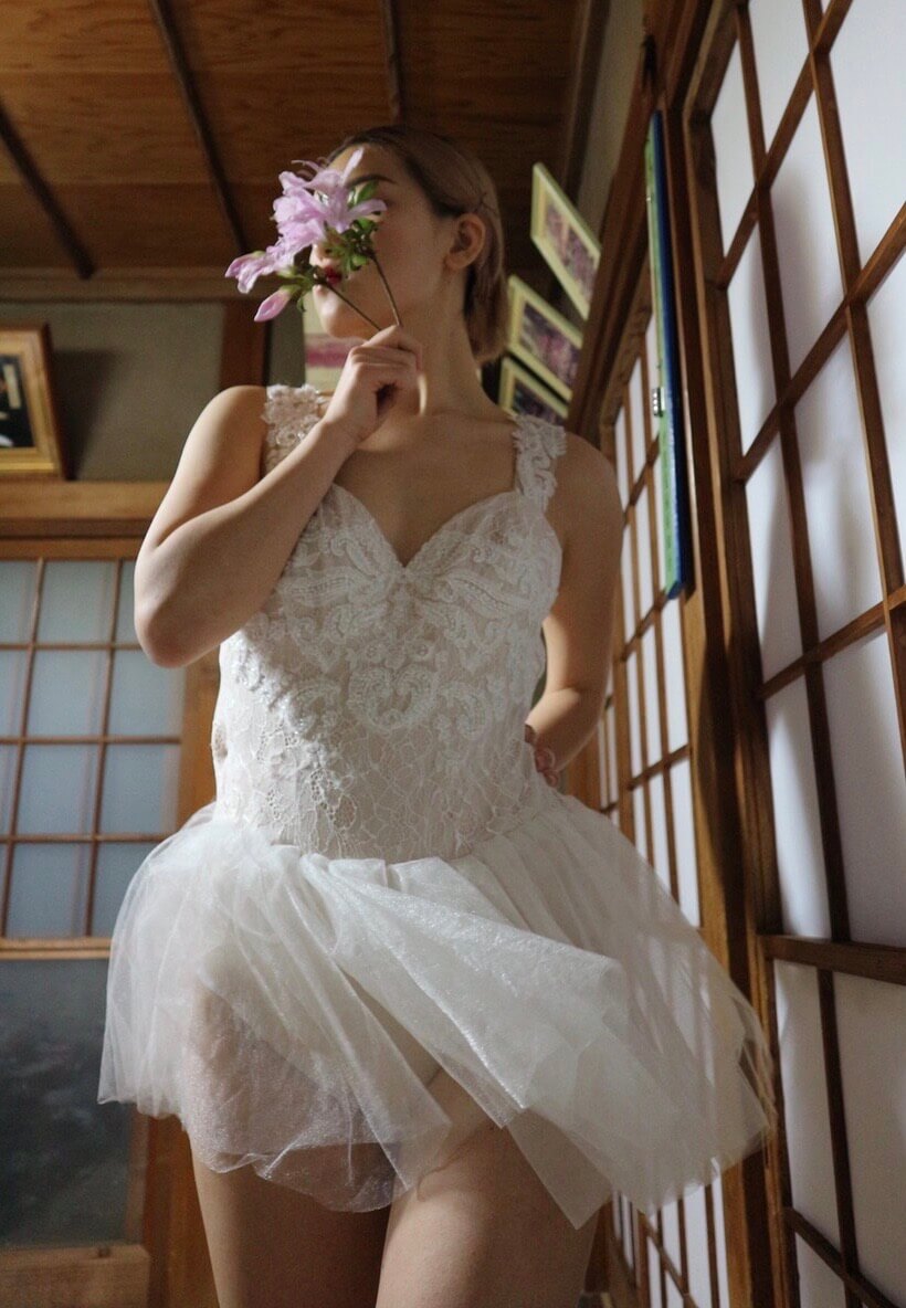 Full body of look which is inspired by the wedding in spring. This is originally a wedding dress that was different size and had long tulle skirt. I recreated to a figure skating costume with tulle, lace, and appliqué which were all from the wedding dress.