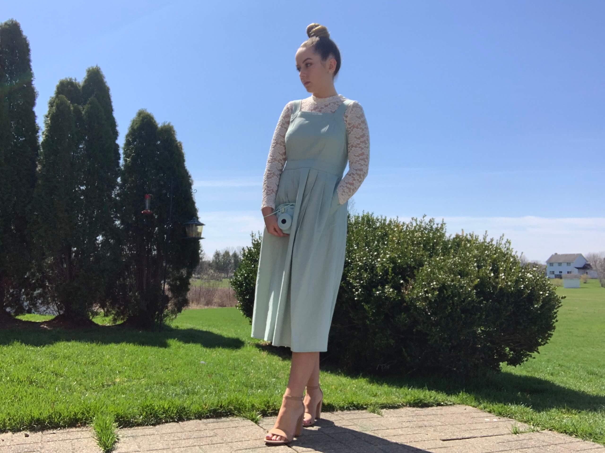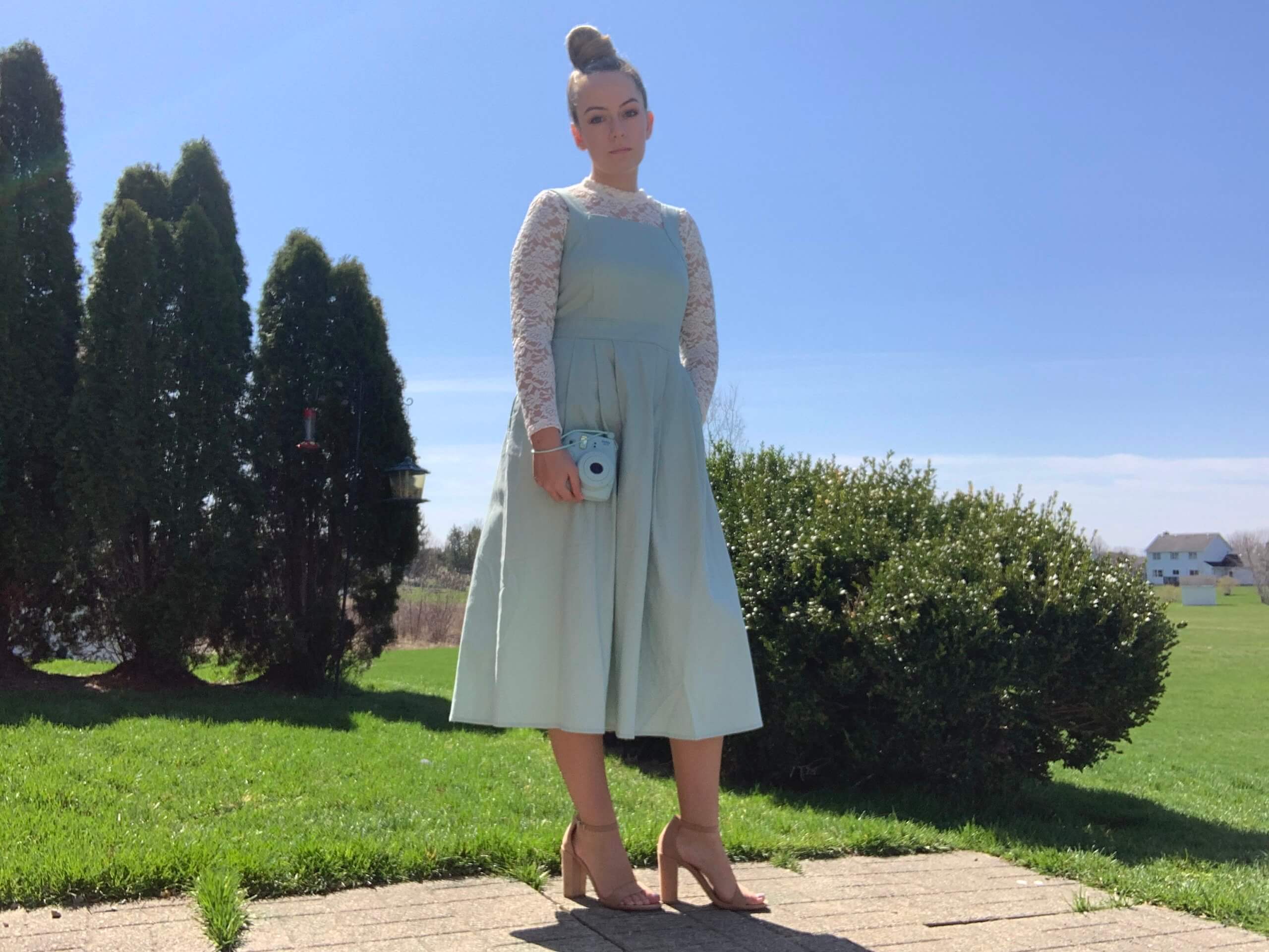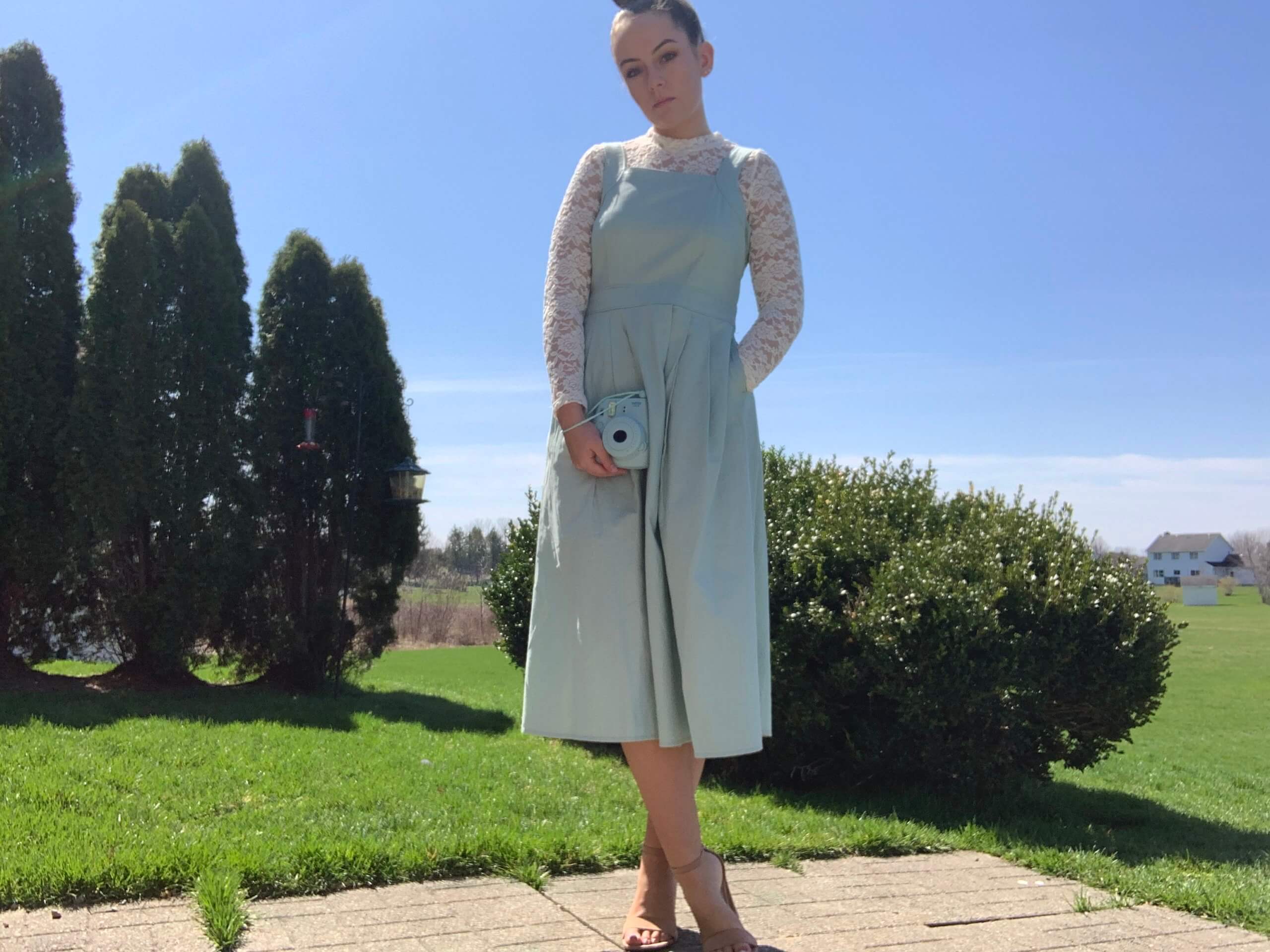 Pastel blue midi dress with square neckline, lack mock-neck long sleeve underlay