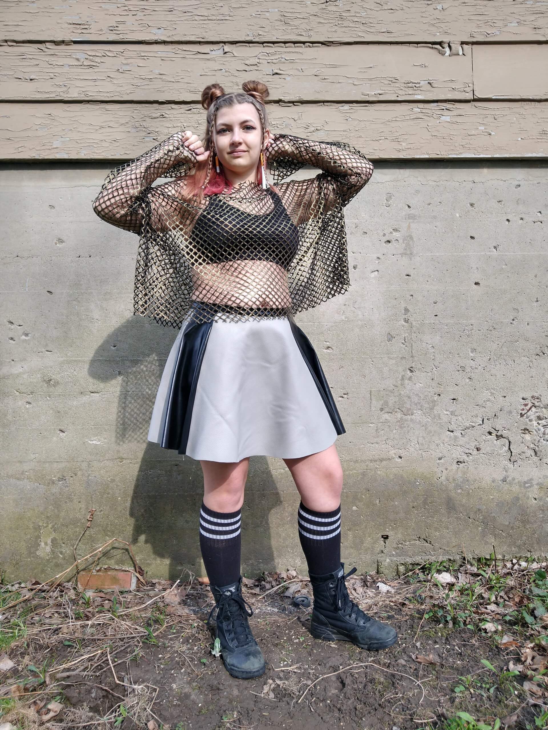 Gold long sleeve fishnet oversized top paired with a grey leather skirt with two black leather stripes down each side. Styled with knee high black socks and army combat boots and fake cigarette earrings