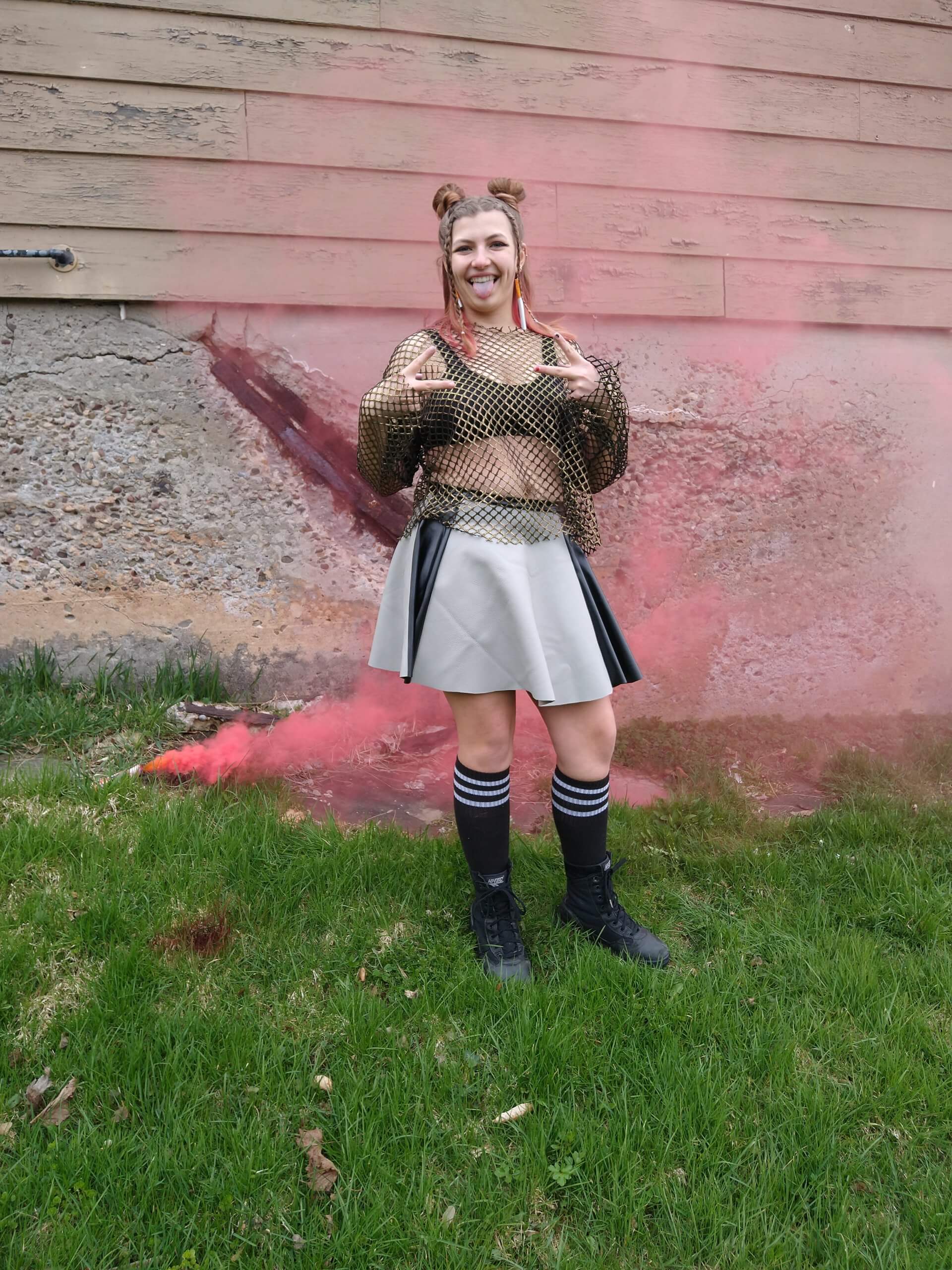 Alexis in a gold long sleeve fishnet oversized top paired with a grey leather skirt with two black leather stripes down each side. Styled with knee high black socks and army combat boots and fake cigarette earrings. Model Alexis Remington is using a red smoke bomb while giving “peace signs” and sticking out her tongue