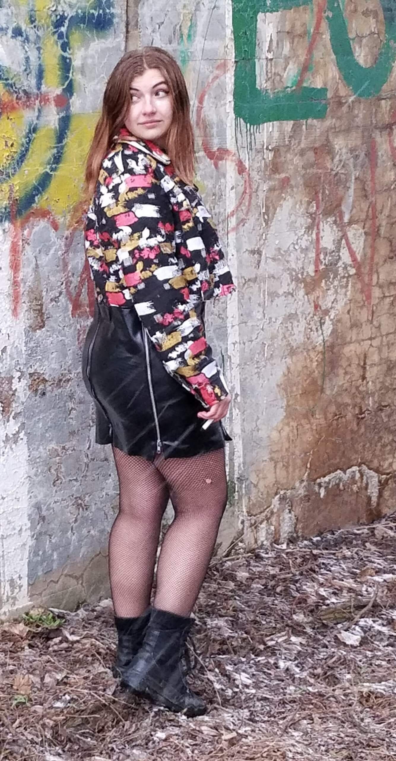 Alexis Remington modeling in a black distressed cropped denim jacket that is painted gold, red, and white over a black cropped shirt. She has on a black pleather skirt with multiple zippers on it. This is styled with ripped fishnets and black combat boots with a black and silver lock necklace standing in front of a graffiti wall