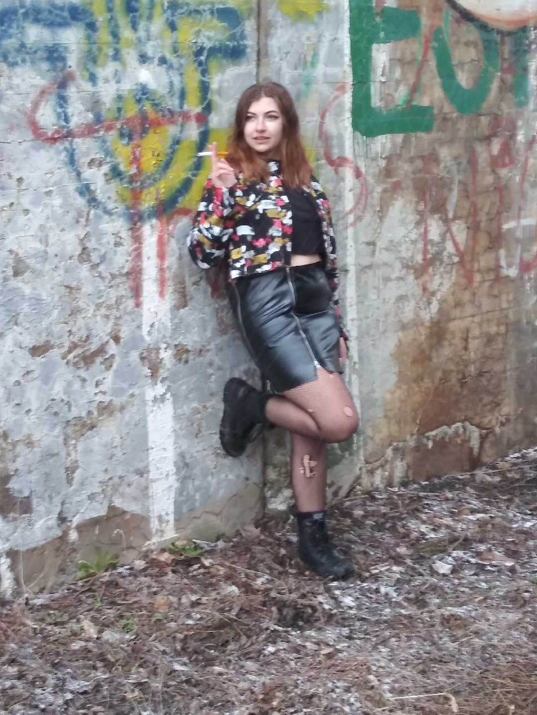 Modeling wearing a black distressed cropped denim jacket that is painted with a black pleather mini skirt with zippers. This is styled with ripped fishnets and black combat boots. Alexis is holding a fake cigarette while leaning against a wall and looking away from the camera