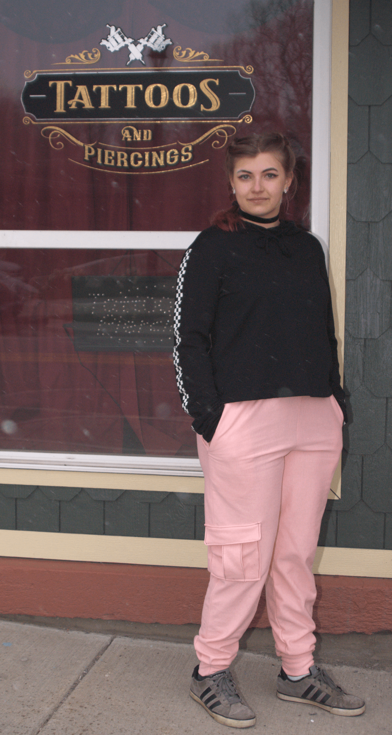 Pink sweatpants styled with a black hoodie with checkerboard stripes down the sleeve and a black velvet choker necklace. Model Alexis Remington is standing in front of Revelation Ink Tattoos and Piercings with her hands in her pockets