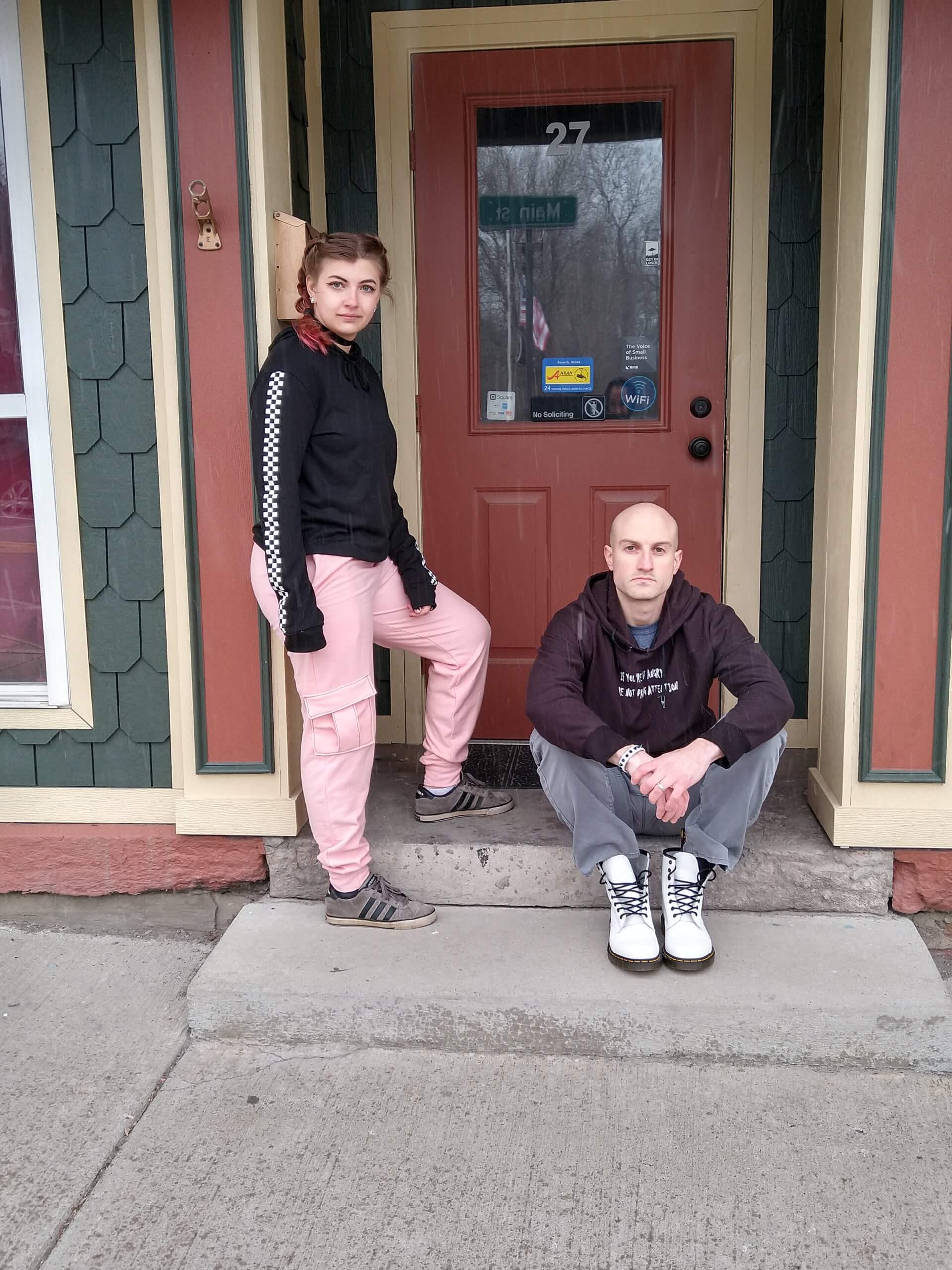 Model Alexis wearing pink sweatpants styled with a black hoodie with checkerboard stripes down the sleeve. She is leaning against a wall with one leg up on a step. Model Ryan Markwith is sitting on the step next to her.