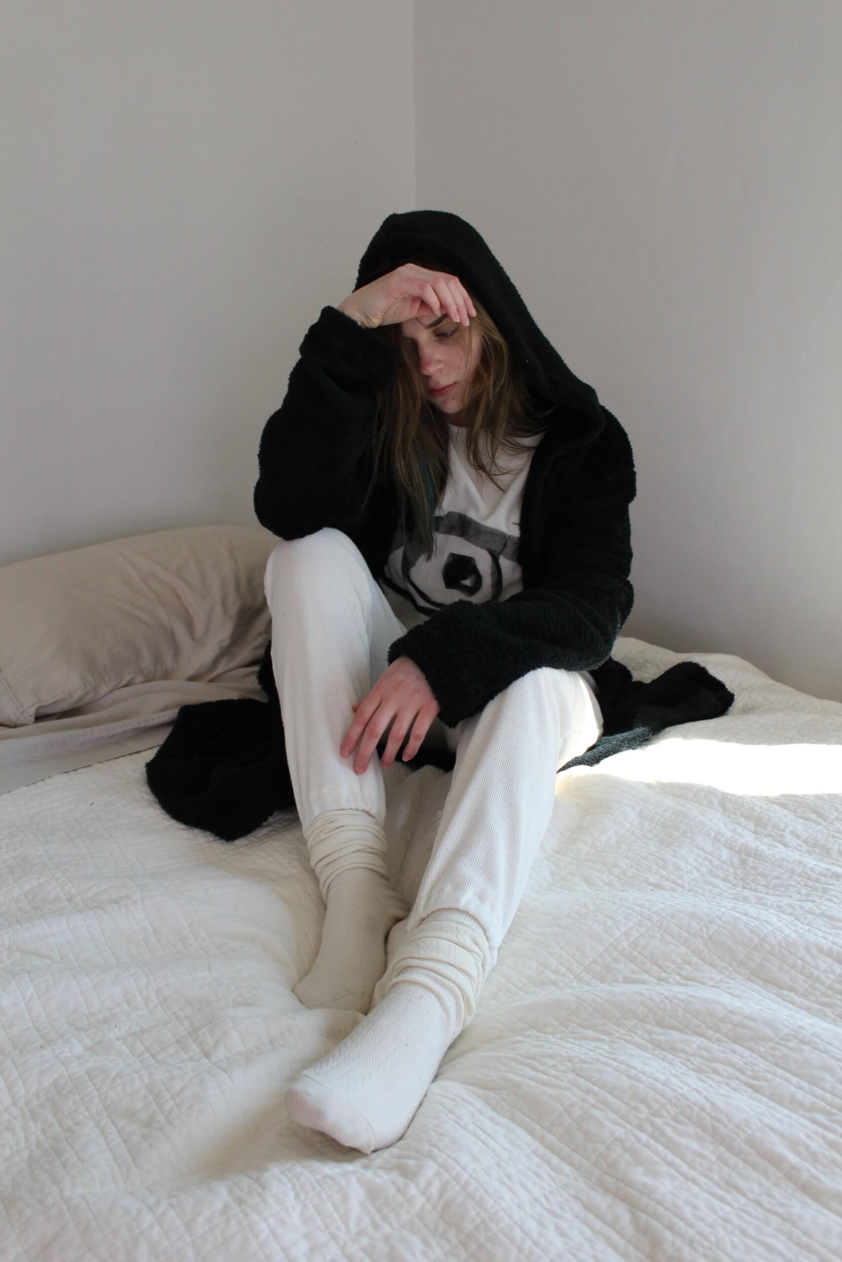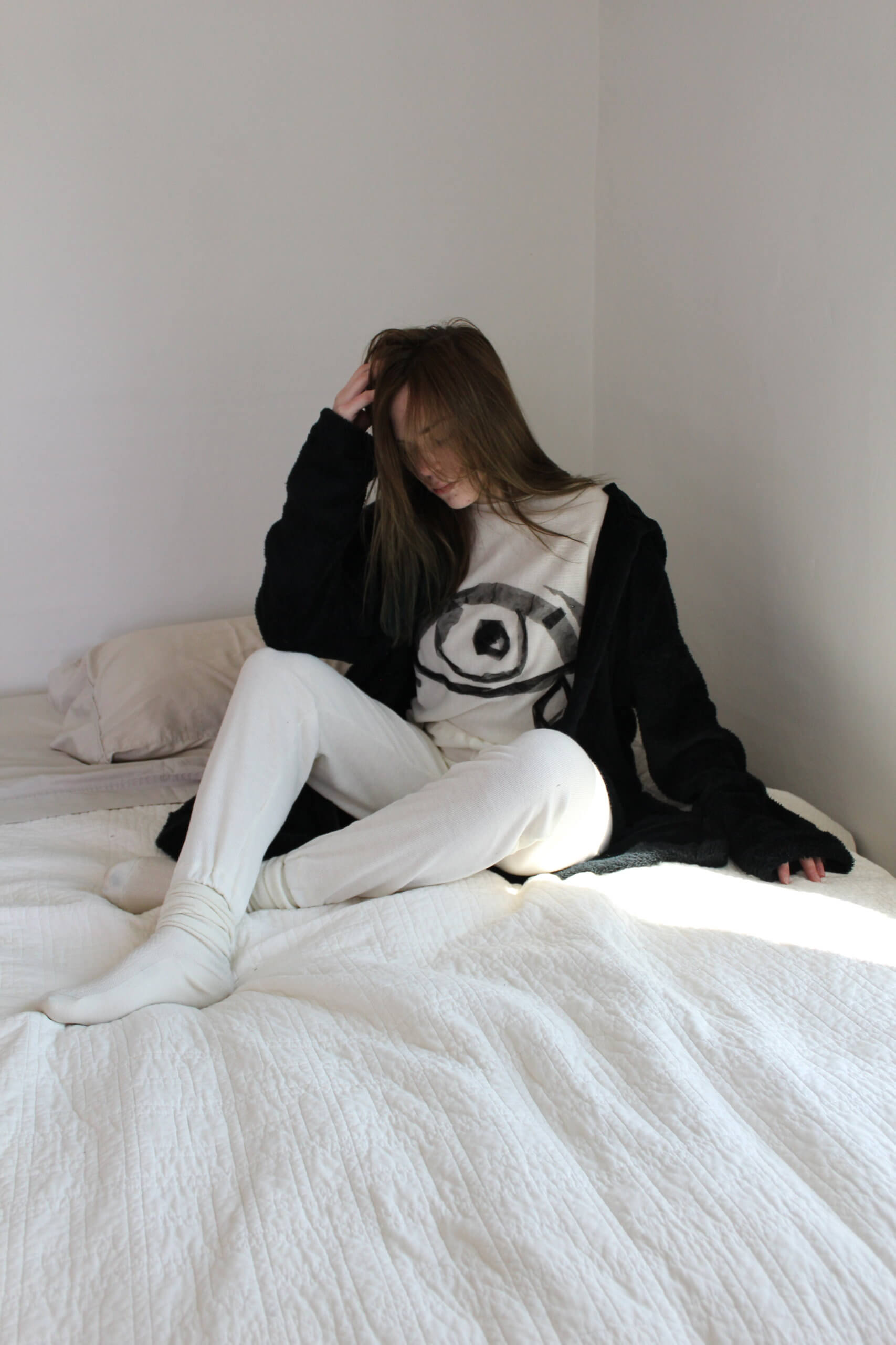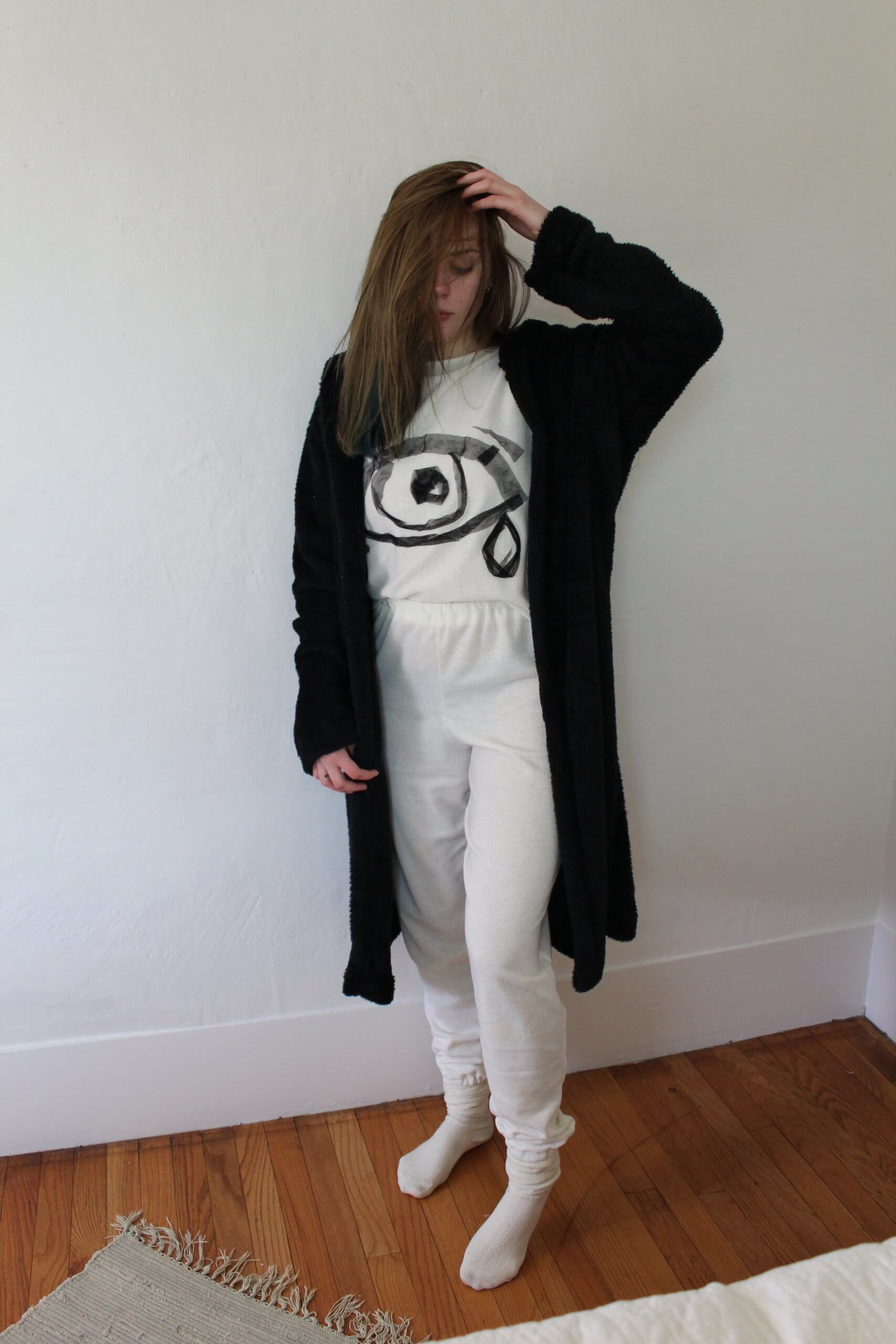 Matching cream tank/sweatpant set with embellished crying eye design and calf length plush black robe cardigan with hood.