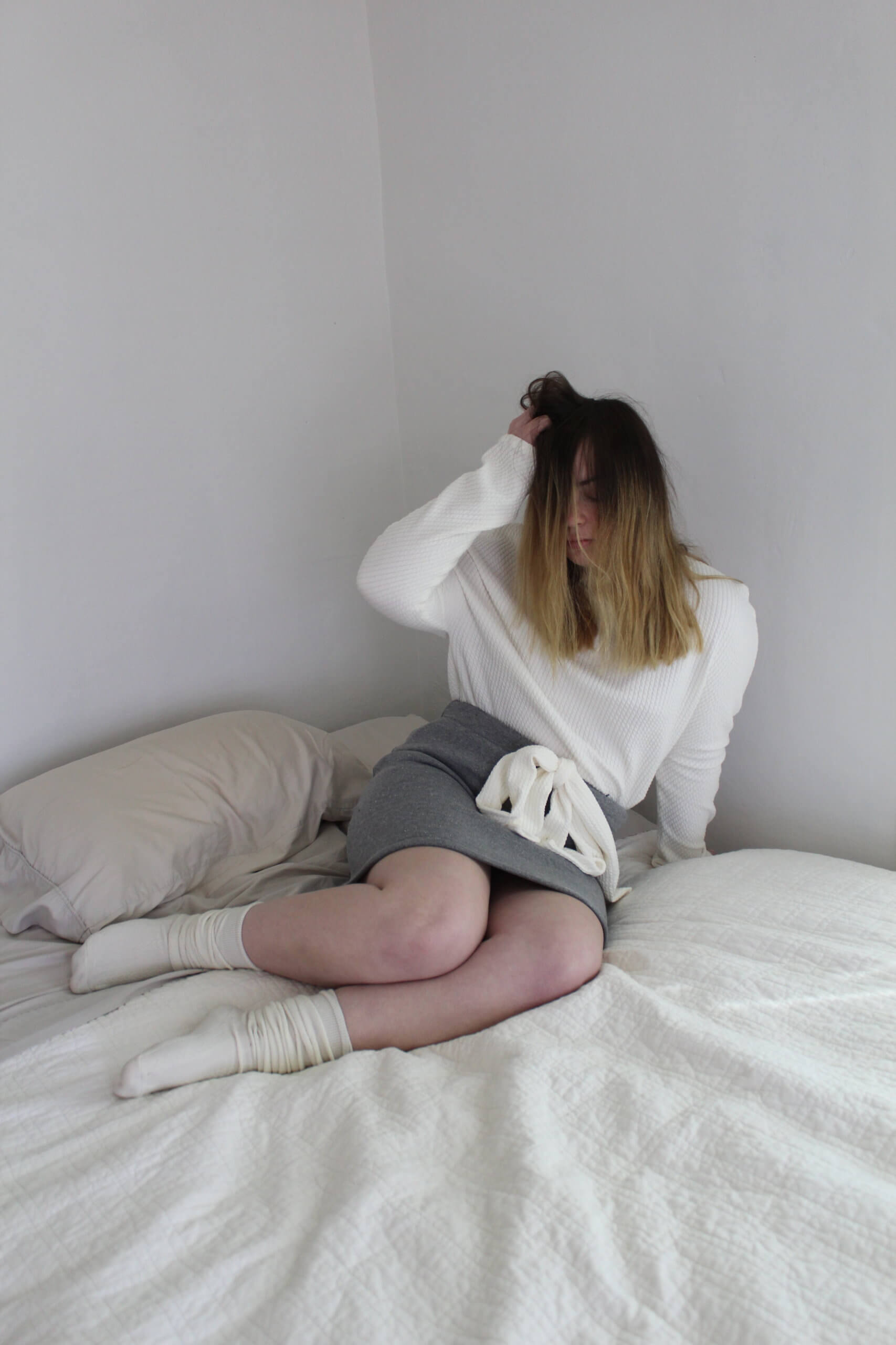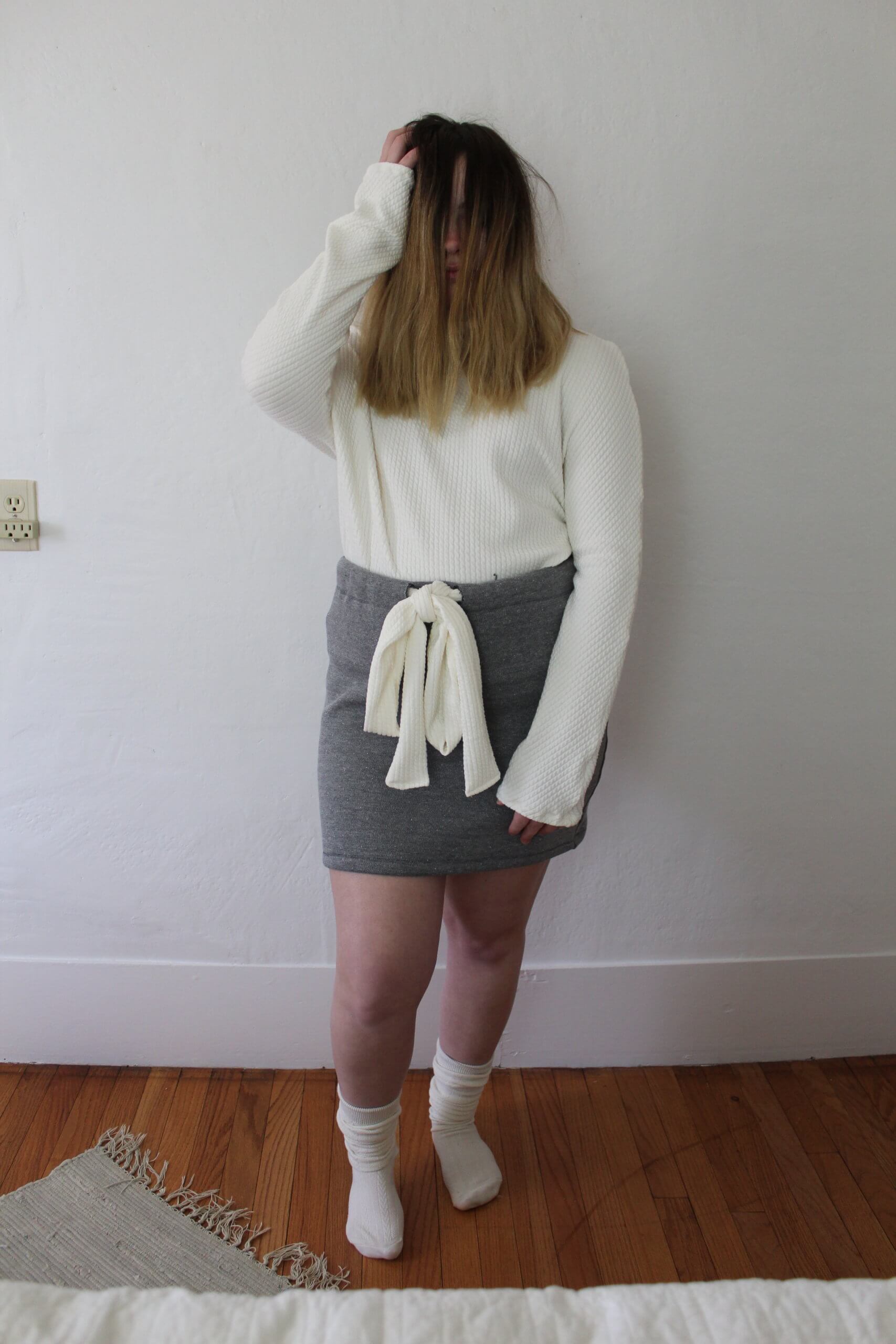 Cream Ribbed long sleeve top and grey sweatpant skirt with cream ribbed accent bow drawstring.